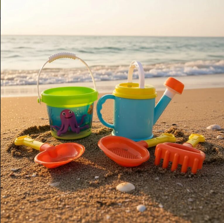 Set de playa infantil con balde mediano, palita, rastrillo y regadera. Ideal para jugar en arena o jardín.